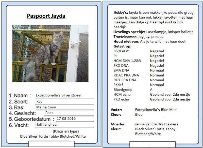 Over mij: 12 november heeft mijn nieuwe personeel mij opgehaald. Ik laat al flink weten wie ik ben. En voelde me gelijk thuis. Ik ben van het oudhuis uit geen honden gewend, maar die Duitse Herder kan ik van de eerste dag al aan. Wat ik van de teckel moet vinden daar ben ik nog niet uit, is het nou een kat of een hond?? Ik probeer alles uit en hoor vanzelf wel wanneer het niet mag(zoals hondenbrokken eten:(dat niet mag). Jayda is graag buiten, zodra de deur van de kattenren open wordt gedaan is zij er als eerste op het afgeschermde stuk tuin. Ze vind het echt leuk om op onderzoek uit te gaan en te genieten van de zon. Elke ochtend als je bent op gestaan komt ze even kopjes geven tegen je benen. Jayda heeft een super lief karakter en is een makkelijke poes. Ze komt uit HCM DNA N/N ouders en ze draagt effen. Als de senseo aan wordt gezet, weet ze niet hoe snel ze binnen en bij de kast moet zitten.