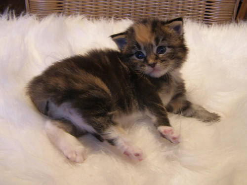 Over mij: Djin is een Black Tortie Tabby Blotched/White, Maine coon poes.. Ze is geboren op 7 februari 2009 via een keizersnee. Djin is heel bijzonder voor mij omdat ik de dierenarts geassisteerd heb bij de keizersnee en ze is me eerste maine coon poesje. 8 mei 2009 is ze bij ons komen wonen. Ze vond het in het begin heel eng omdat ze geen honden gewend was. Maar na een week de krabpaal bewaakt te hebben kwam ze langzaam aan los. Nu voelt ze zicht er helemaal bijhoren en is de grootste maatjes met de rest. Djin is een actief, speels en behulpzaam poes. Alles wat nieuw is wil ze komen bekijken en ze is gek op melkproducten, alleen krijg ze het niet. En ze hou graag de boel een beetje in de gaten. Ze zit overal met haar neus bovenop van nieuwgierigheid. Ook heeft ze haar rustige kanten. Djin gaat regelmatig mee naar de kattenshow. Ze vind het heel erg leuk en op de keurtafel laat ze zich van haar charmantste kant zien. Maar ook Djin heeft soms haar dag niet en kan dan wel eens nukkig zijn.